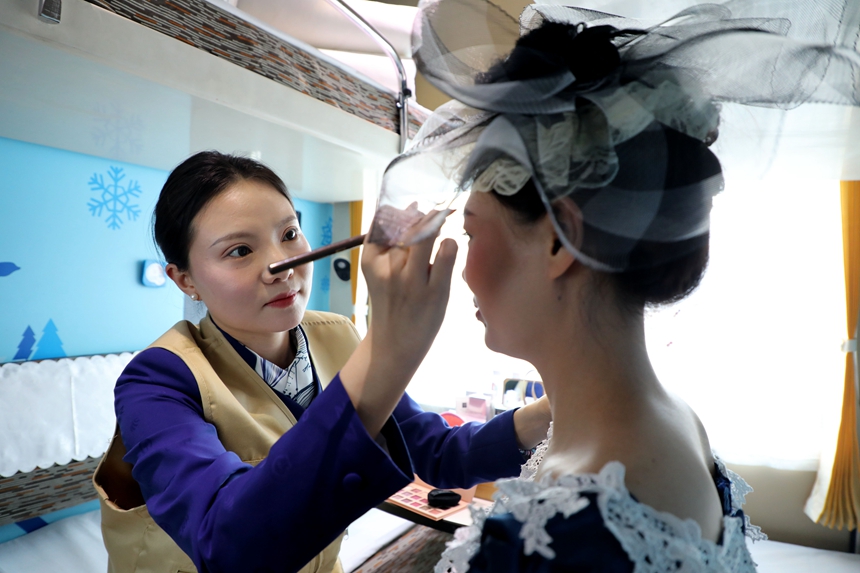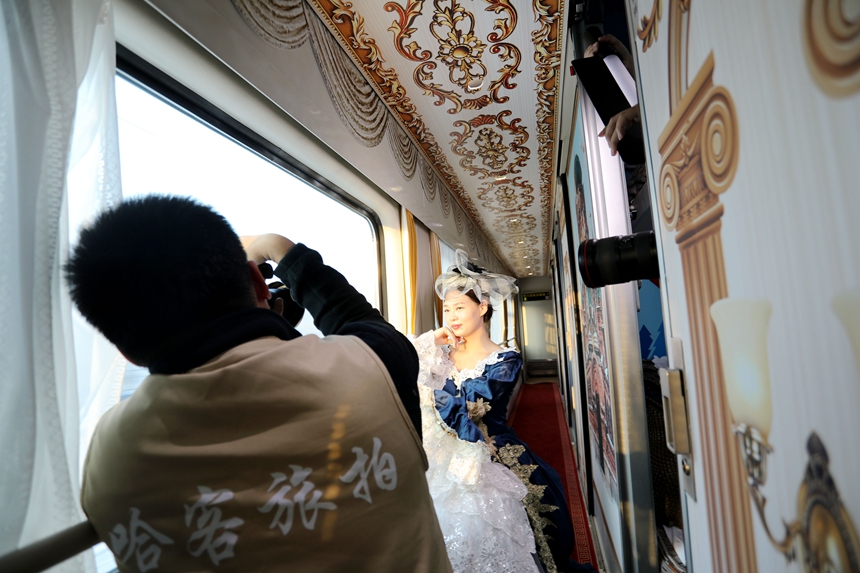 冰雪旅拍列车上设置了哈尔滨街景、欧式风情、奇幻之旅、冰雪奇遇、民俗文化等主题场景,准备了中式、西式、民俗等多种风格旅拍服饰,免费为旅客提供。同时,铁路部门组建了一支爱好摄影、化妆的铁路职工旅拍团队,利用业余时间为旅客免费提供拍照和妆造服务,让游客的旅途“更出片”,让旅拍服务“动”起来、“活”起来。