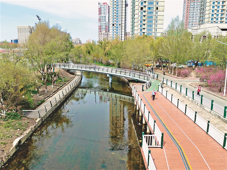 5日,哈尔滨市南岗区和兴路附近的马家沟畔,市民在新建的观光栈道上一边散步,一边欣赏两岸风景。