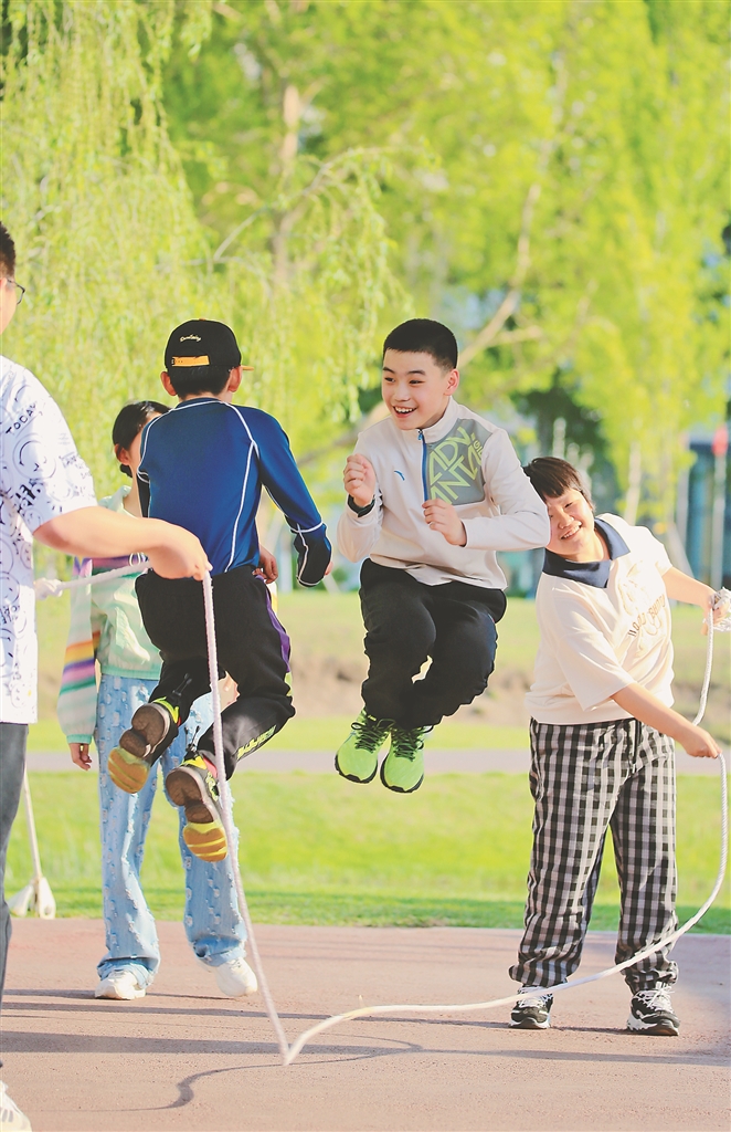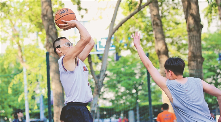 公园里,小区内,大人带着宝宝出来晒太阳,少年们在一起游戏,年轻人在篮球场上激烈对抗,跑步者穿过一片片绿荫……到处洋溢着蓬勃的生机与活力。(记者 张澍 摄)