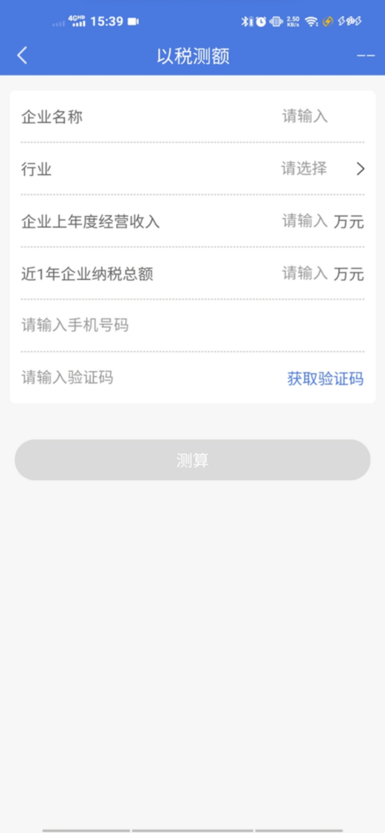 输入企业相关信息、手机号以及验证码,点击测算,可实现实时测额,实时授信,实时支用。