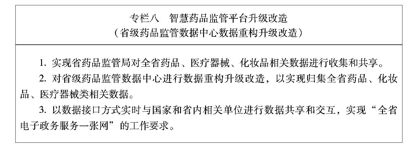 10.全面开展药品监管科技攻关。继续巩固和完善智慧药品监管平台建设,启动药品(疫苗)电子追溯体系等4个药品监管平台建设与应用,不断推动监管方式转变和监管效能提升。采取“国家平台升级+地方平台改造对接”的方式,完成与国家平台统一门户、数据共享、应用协同等不同深度的对接。建成上下统一的业务协同、安全可靠的一体化云计算和大数据中心,解决基础性、关键性、前沿性和战略性的技术问题。