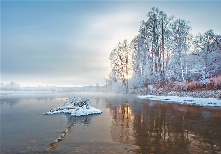 零下40多摄氏度的低温使城镇周边的河水像烧沸了的开水般冒着热气,河边树木、枯草都挂满了冰晶,在阳光的照射下格外美丽。银枝玉条,雾凇美景,让呼玛河两岸成为“百里画廊”。