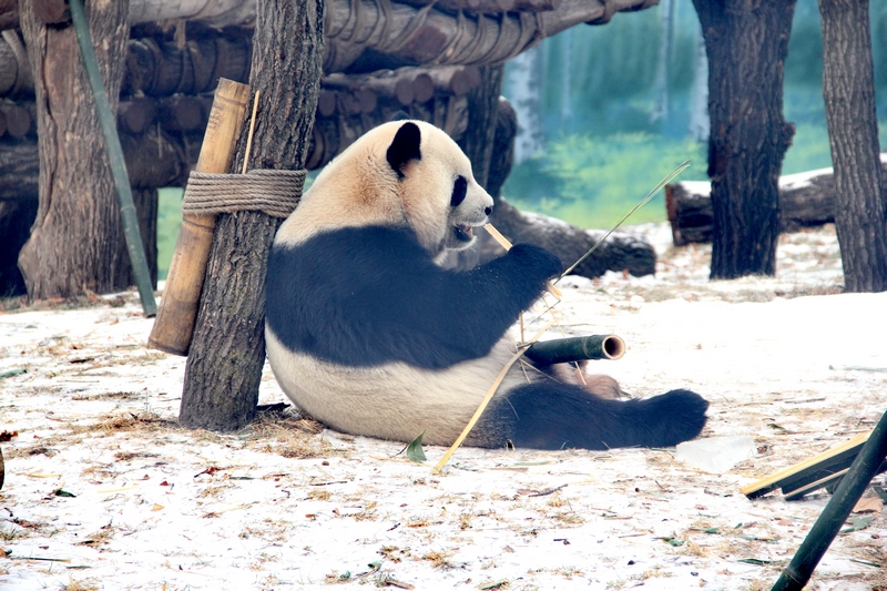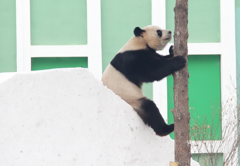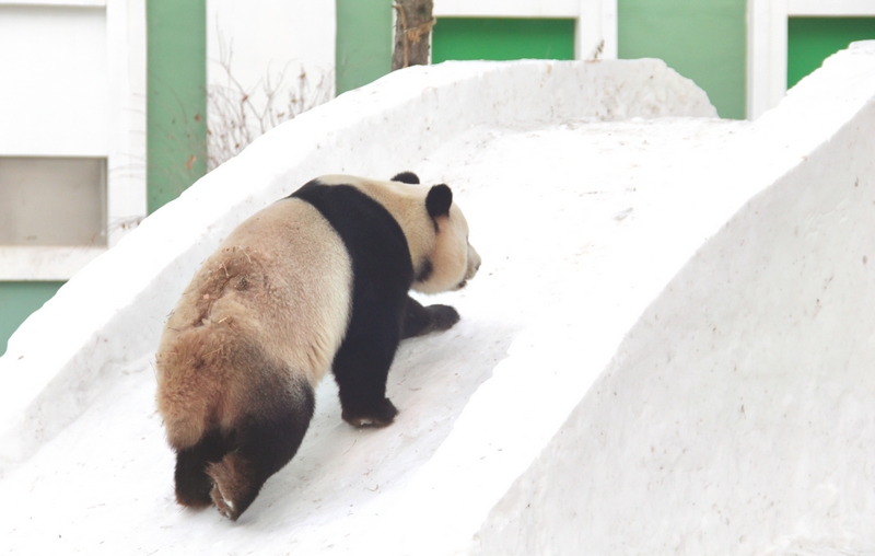 憨态可掬的大熊猫时而坐在雪地里吃着美味的竹子,时而在雪地里散步、玩耍,时而爬上工作人员制作的雪滑梯,打个“出溜滑”……