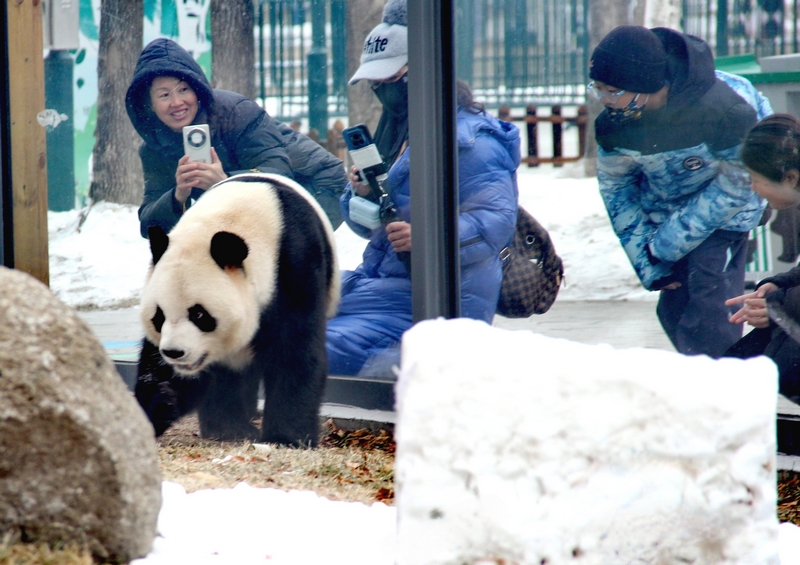 7日,哈尔滨太阳岛风景区大熊猫馆内,许多南方游客在观看“芝士”和“芝麻”两只大熊猫在冰天雪地里的生活。