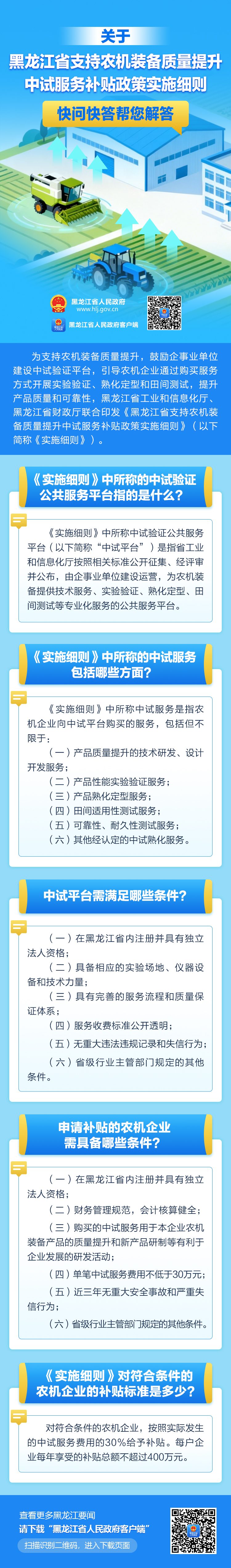 关于黑龙江省支持农机装备质量提升中试服务补贴政策实施细则,快问快答帮您解答!