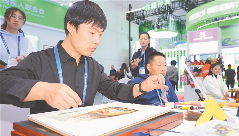 在双鸭山展区,赫哲族鱼皮制作技艺传承人尤雪淞的展台前挤满了年轻人。鱼皮制成的头饰、车挂饰、手链等30余款文创产品,保留了天然纹理,却以明快色彩与现代设计颠覆传统认知。